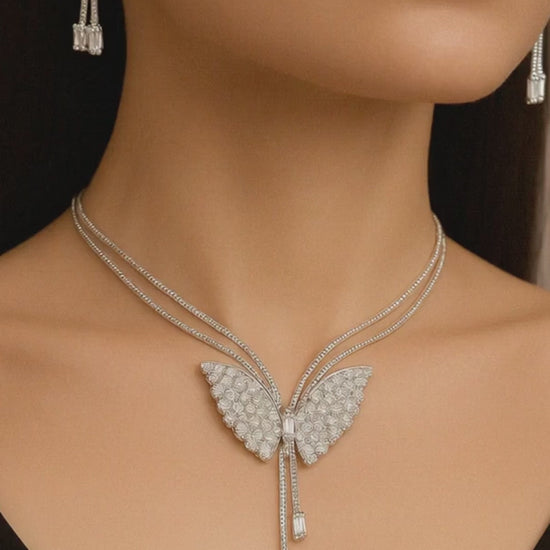 Silver Butterfly Pendant Necklace Set with Crystal-Studded Earrings, Elegant and Lightweight Party Wear Jewellery